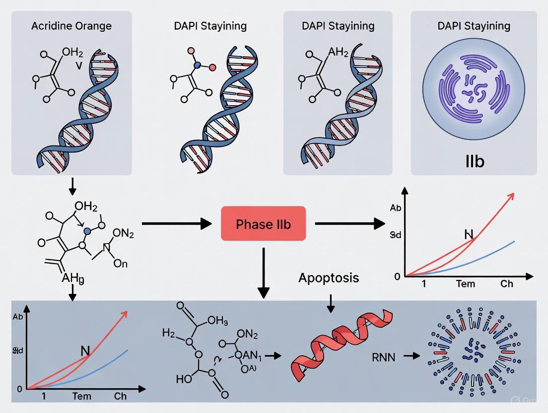 Acridine Orange and DAPI staining establishes itself as a uniquely powerful, specific, and adaptable method for apoptosis quantification, particularly well-suited for the demands of high-throughput screening in Phase IIb drug development. Its key advantages—simultaneous quantification of live, apoptotic, and necrotic cell populations, high specificity for classical apoptotic morphology, and compatibility with 96-well formats—make it an indispensable tool for evaluating compound efficacy. Future directions should focus on the integration of this morphological assay with functional metabolic readouts to provide a more holistic view of cellular health, the continued development of standardized controls to ensure data integrity across global research sites, and its expanded application in complex 3D cell models and organoids that more accurately recapitulate the in vivo tumor microenvironment. By mastering this technique, researchers can generate robust, reliable data critical for making go/no-go decisions in the therapeutic pipeline.
