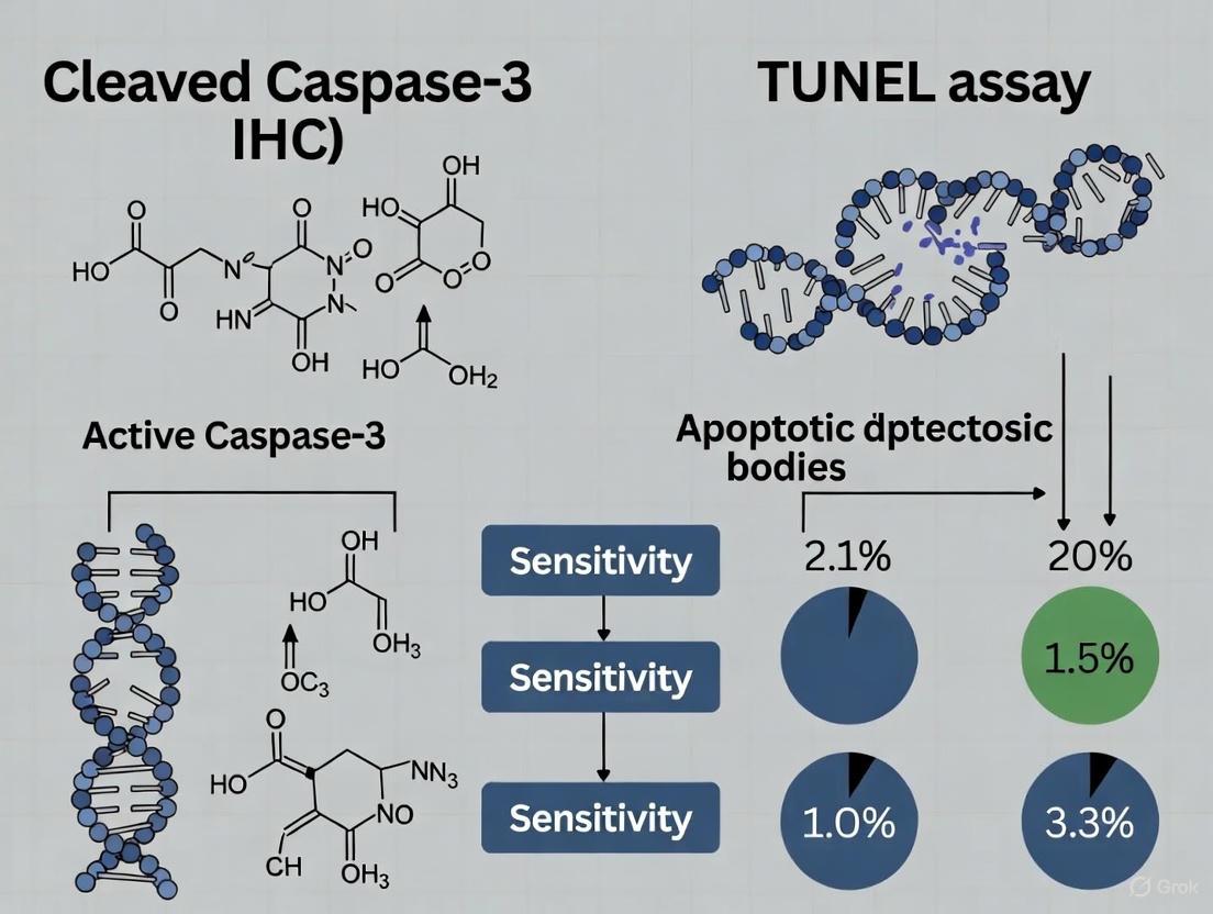 Accurately detecting and quantifying apoptosis is fundamental for biomedical research in cancer biology, drug development, and toxicology. This article provides a systematic comparison of two cornerstone techniques: immunohistochemistry for cleaved caspase-3 and the TUNEL assay. We explore the foundational principles of each method, detailing their specific protocols and applications across diverse research models, from tissue sections to 3D cultures. A key focus is troubleshooting common pitfalls, such as the antigen retrieval incompatibility of proteinase K in TUNEL with multiplexed protein detection, and offering optimization strategies. By synthesizing evidence from direct comparative studies and validation frameworks, we deliver clear guidelines for method selection based on sensitivity, specificity, and research context, empowering scientists to make informed decisions in their experimental design.